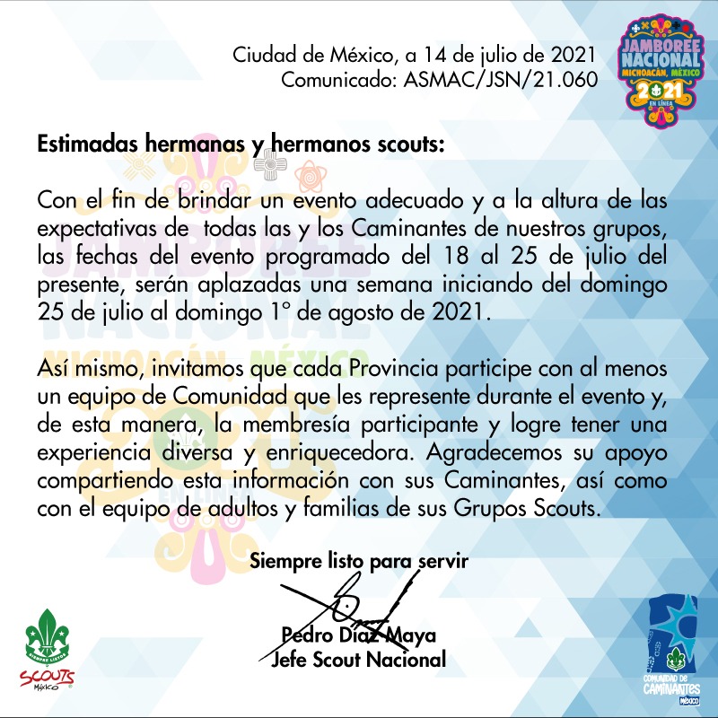 Las condiciones sanitarias del año 2020, nos obligaron a reprogramar para este 2021 el Jamboree Nacional de Caminantes. Hoy estas condiciones se mantienen similares, por lo que, con el propósito de que no te quedes sin vivir esta gran experiencia, y con el mismo esfuerzo y espíritu Scout con que hemos realizado otros eventos nacionales, te invitamos hoy al Jamboree Nacional de Caminantes en línea 2021.