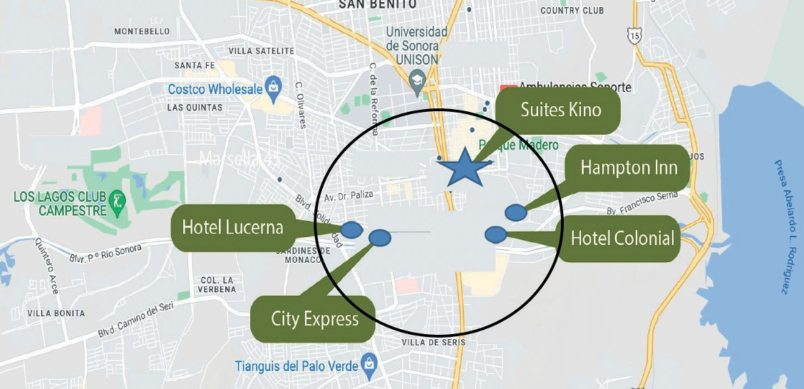 Aeropuerto Internacional de Hermosillo, Sonora. Ubicado en Carr. Hermosillo, Bahía Kino, Aeropuerto, 83220. Hermosillo, Sonora, se encuentra aproximadamente a 11 km de distancia de la sede del evento y en tiempo recorrido en auto de 17 a 23 min.